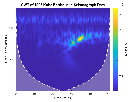 load kobe; dt = 1; cwt(kobe,1); title('CWT of 1995 Kobe Earthquake Seismograph Data');
