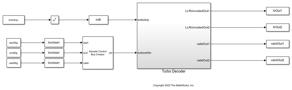 This figure shows the top level model architecture of a turbo decoder. The model accepts three samples at a time with the corresponding start, end, and valid control signals.