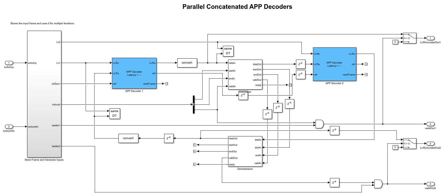 The following figure shows how the APP Decoder blocks are connected in parallel to build a turbo decoder. The output from the first decoder is interleaved and provided as an input to the second decoder and the output from the second decoder is de-interleaved and provided as an input to the first decoder forming a feedback loop. The Interleaver and Deinterleaver blocks are implemented based on the HDL Interleaver and Deinterleaver example. The Store Frame and Generate Inputs subsystem stores the frame and provides input to both the decoders based on the number of iterations. The stopTime value is adjusted so that the model runs for the specified number of frames, number of iterations, and frame length.