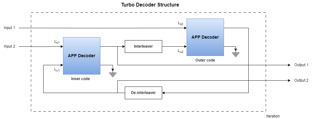 The invention of turbo codes [ 1 ], along with the development of iterative decoding principles with near Shannon limit performance, has led to their integration in a wide variety of applications. Some of the applications include deep space communications, third generation wireless standards, and digital video broadcasting [ 2 ]. You can achieve iterative decoding by using two APP Decoder blocks and by having the encoders send the output soft information to each other forming a feedback loop. The block diagram shows the conceptual design of a turbo decoder for one iteration.