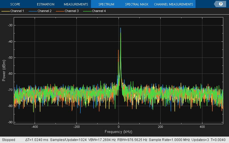 spectrumScope = spectrumAnalyzer(SampleRate=sampleRate); timeScope = timescope(TimeSpan=4/transmitToneFrequency,SampleRate=sampleRate);