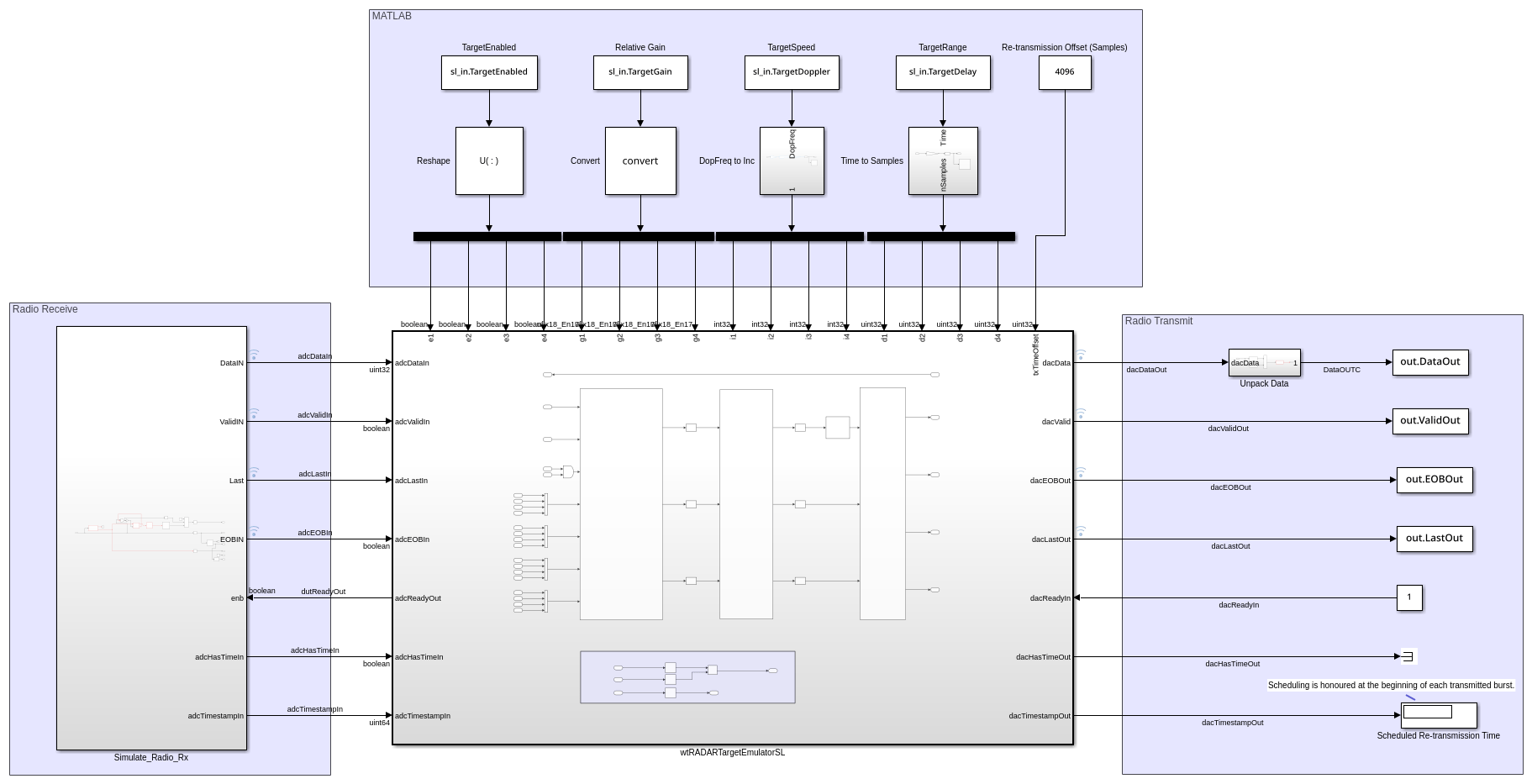 The model provides data for, and saves the output data from, the wtRADARTargetEmulatorSL subsystem.
