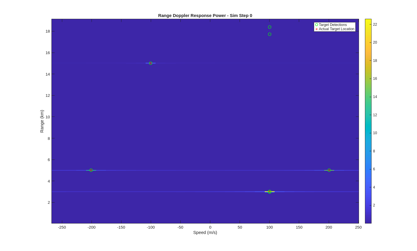 rdResponse = phased.RangeDopplerResponse(... 'DopplerFFTLengthSource','Property', ... 'DopplerFFTLength',sl_in.VelDimLen, ... 'PRFSource','Property', 'PRF',sl_in.PRF,... 'SampleRate',sl_in.Fs,'DopplerOutput','Speed', ... 'OperatingFrequency',sl_in.Fc); % Create a 2D CFAR object for detection generation cfar = phased.CFARDetector2D(GuardBandSize=[25 1],... TrainingBandSize=[10 1],... ProbabilityFalseAlarm=1e-4); fig = figure; ax = axes(fig); helperVisualizeRadarTargetSimulation(sl_out,sl_in,rdResponse,cfar,0,ax);