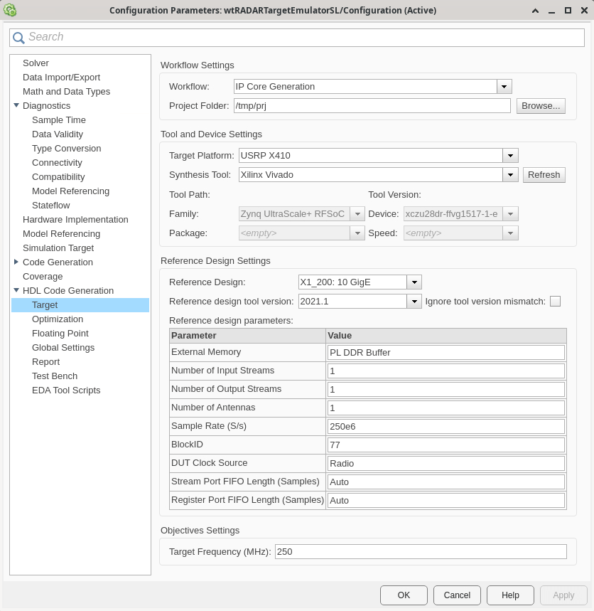 In HDL Code generation > Target > Tool and Device Settings, set Target Platform to USRP X410. If you are using a different USRP radio, select the corresponding target platform and adjust the reference design parameters accordingly.