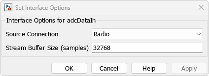 Each streaming interface data input and output port has an options menu. To retransmit the received samples, set the source and sink connection options to Radio. For the adcDataIn options, set the stream buffer size to 32768, which is the default setting. The buffer size must be a power of two to ensure optimal use of the FPGA RAM resources. The buffer size is specified in terms of the number of samples.