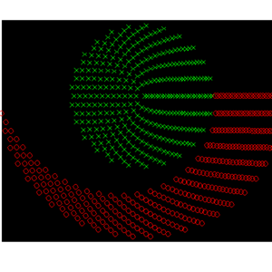 plot(i/2*cos(2*pi*C/P(i)),i/2*sin(2*pi*C/P(i)),'xg')