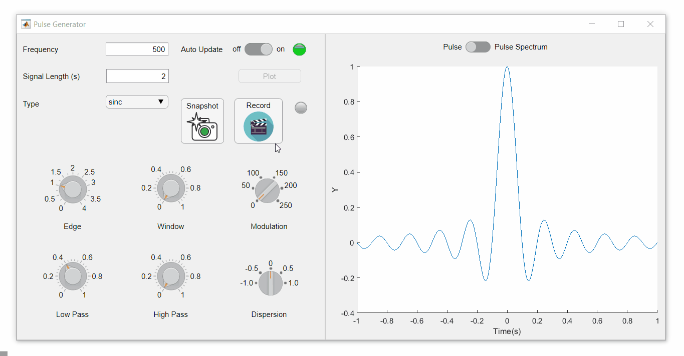 To demonstrate this, I adapted a copy of Matlab's built-in PulseGenerator.mlapp by adding