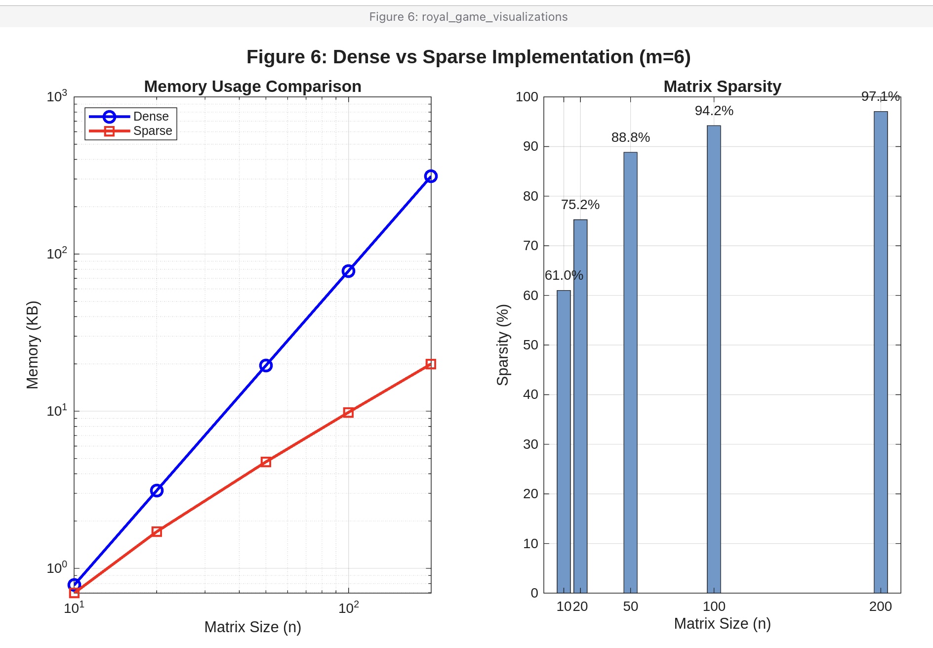 Figure 6: Performance comparison showing construction time and memory usage for dense vs sparse implementations as n increases.