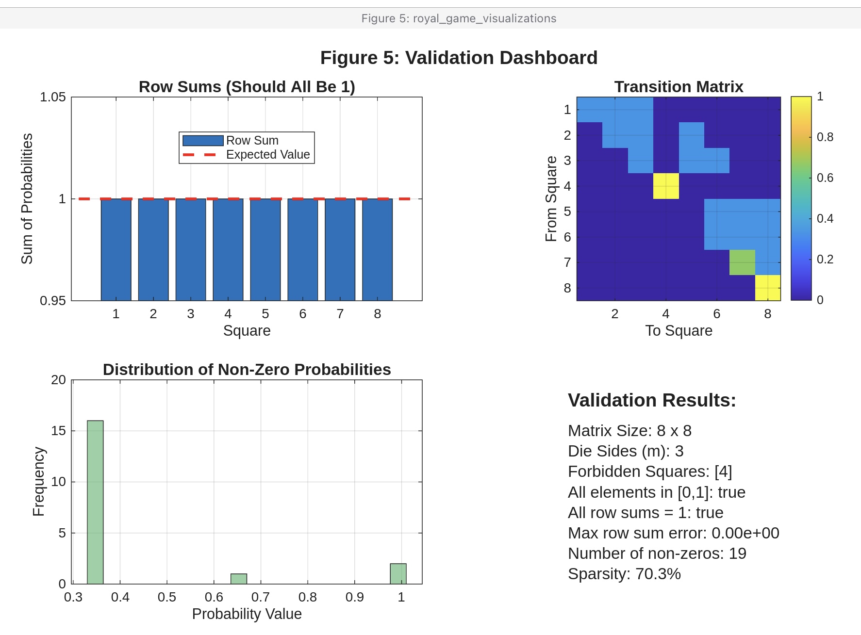 Figure 5: Validation dashboard showing row sums (should all be 1), matrix properties, and comparison with expected structure for a simple test case.