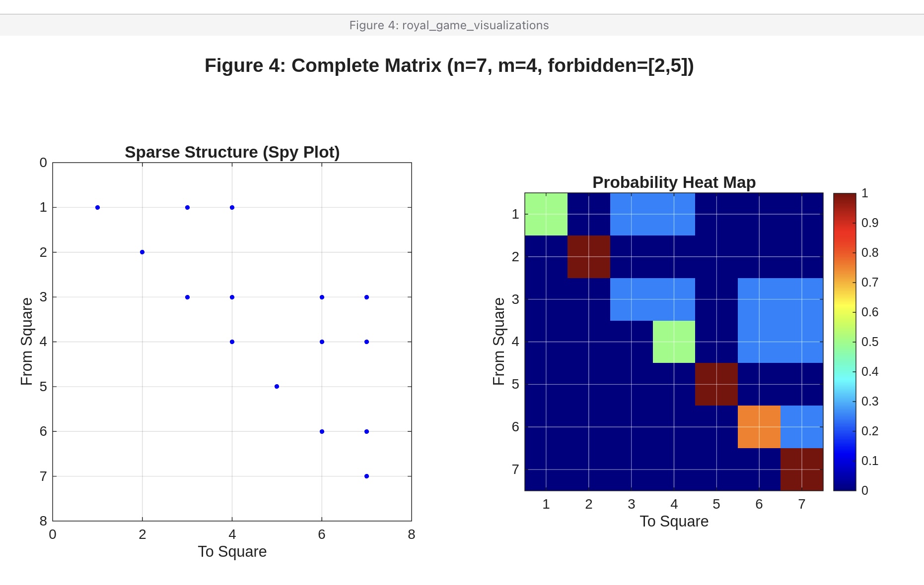 Figure 4: Complete transition matrix for a test case with n=7, m=4, nogo=[2 5]. Spy plot showing the sparse structure alongside a color-coded heat map. Notice the complex pattern of probabilities.