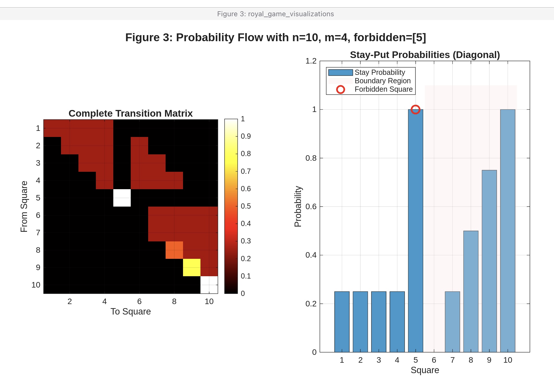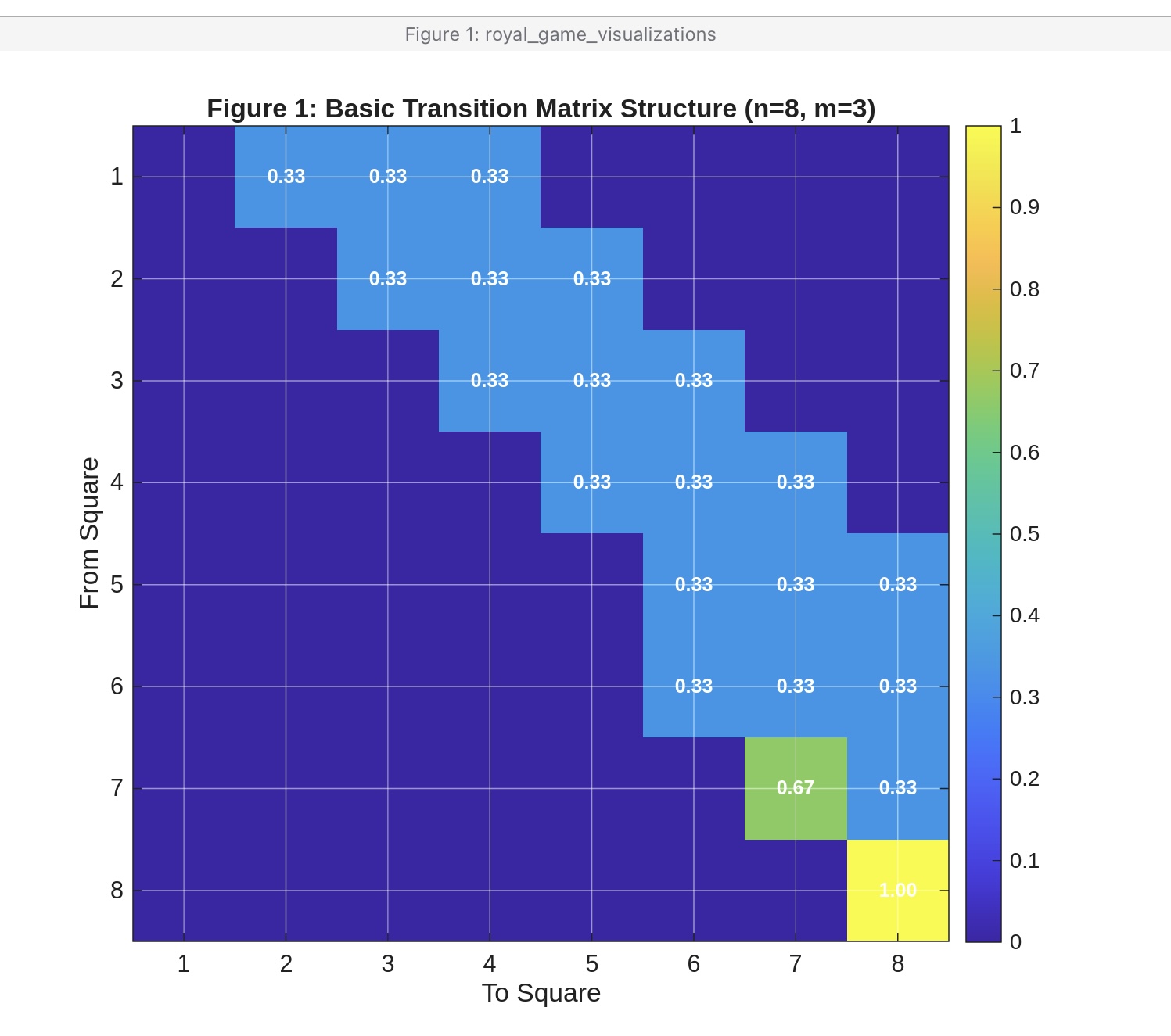 King Neduchadneddar may have thought he was creating an impossible puzzle, but armed with MATLAB's matrix manipulation prowess, you've seen that elegant solutions exist. The key insights are recognizing the superdiagonal structure, handling forbidden squares through logical indexing rather than explicit loops, and carefully managing boundary conditions to ensure probability conservation. The transition matrix you've constructed doesn't just solve a Cody problem; it represents a complete probabilistic model of the game that could be used for further analysis, such as computing expected game lengths or steady-state probabilities.