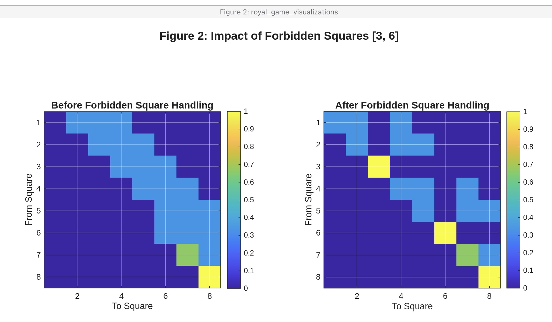 Figure 2: Transition matrix with forbidden squares marked. Left: before adjustment. Right: after forbidden square handling showing probability redistribution. Compare the diagonal elements.