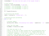 One general-purpose script is given along with three particular examples. The first example (“Header_Removing”) demonstrates how to remove the first 10 lines (the header) from multiple .txt files containing data from oscilloscope measurements. In the second example (“Mat2Xls”) the conversion of multiple .mat to .xls files is shown. The third example (“Signal_Denoising”) illustrates the process of signal denoising (power line hum filtration) of multiple .wav files.
