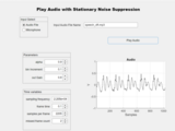 This application showcases the utilization of multiple threads for processing an audio stream. Users have the option to choose their audio input source, which can be a microphone or an audio file. As the app plays the audio, it actively suppresses static noise in real-time. It operates using a background thread that doesn't rely on the Parallel Computing Toolbox. However, this background thread is restricted from any external I/O interactions, including accessing the audio driver. As a result, it can only carry out signal processing tasks on each data frame. The specific signal processing technique applied in this context is the frame-by-frame suppression of static noise.