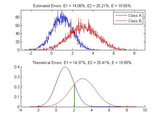 The provided functions demonstrate a histogram-based measure for class separability, given the samples from two classes (binary classification problem). The proposed error classification estimation method is described in (B) and it is based on estimating the pdf of each class using histograms. The function that estimates the class seperability method is computeHistError(). Function theoreticalError() computes the theoretical error for two Gaussian distributed classes. Function testClassSeperability() calls the other two functions and displays the results for two Gaussian distributed functions. It has to be noted that computeHistError() can be used for any kind of class distribution, since it estimates the pdf of each class using the histogram method.