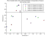 Statistics fundamentals of the Correspondence Analysis (CA) is presented in the CORRAN and MCORRAN1 m-files you can find in this FEX author''s page. CA can be extended to more than two categorical variables, called Multiple Correspondence Analysis (MCA). CA and MCA are graphical techniques for representing the information in a two-way or higher-order multiway contingency table. They contain the counts (frequencies) of items for a cross-classifications of the categorical variables (Rencher, 2000).