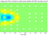 A 4.65 micron x 5.85 micron structure is taken with 7x9 periodic structures of square dimensions (made of silicon i.e n=3.4) having 0.15 micron as the length of a side as a 7x9 rectangular array at the centre of the domain with a separation of 0.45 micron between neighboring structure both horizontally and vertically. The region in between and surrounding that of the structures are filled with air of refractive index, n=1. A central horizontal line from left of 3 periodic structures are removed followed by removal of 3 periodic structures in the center vertically down to form a splitter wave guide from left to center to right through two wings of removed periodic structures horizontally placed on either side of initial central waveguide. Light is guided through this structure to obtain splitting. Here Mur's absorbing boundary condition is used.