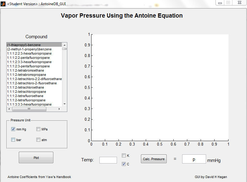 David Hagan (2025). Antoine Equation: GUI (https://uk.mathworks.com/matlabcentral/fileexchange/37523-antoine-equation-gui), MATLAB Central File Exchange. Retrieved .