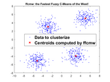 When you need to clusterize data, fuzzy c-means is an appealing candidate, being it more robust and stable than the k-means clustering algorithm. This implementation is faster than that found in the Fuzzy Logic Toolbox (fcm.m). In addition, you can run it without having to buy the FL Toolbox. With this entry I want to stimulate the involvment of other users, to further speedup it and with the ultimate goal to eventually find the TRUE fastest fcm in the West!!