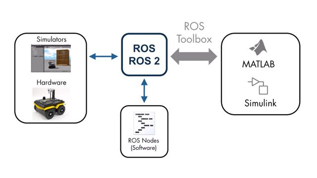 ROS Toolbox provides an interface connecting MATLAB and Simulink with the Robot Operating System (ROS and ROS 2). With the toolbox, you can design a network of ROS nodes and combine MATLAB or Simulink generated ROS nodes with your existing ROS network.