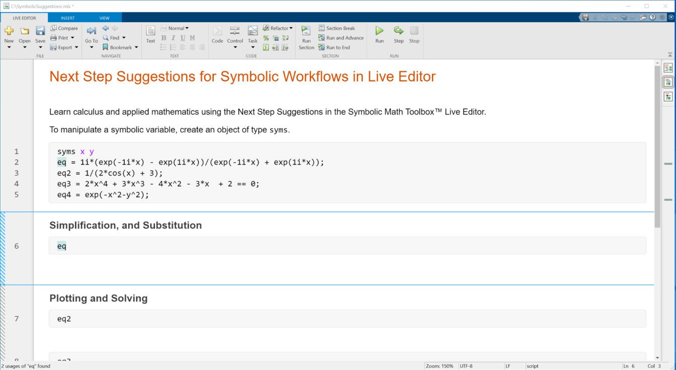 See how to use the next step suggestions menu in Live Editor for guidance on symbolic math workflows.